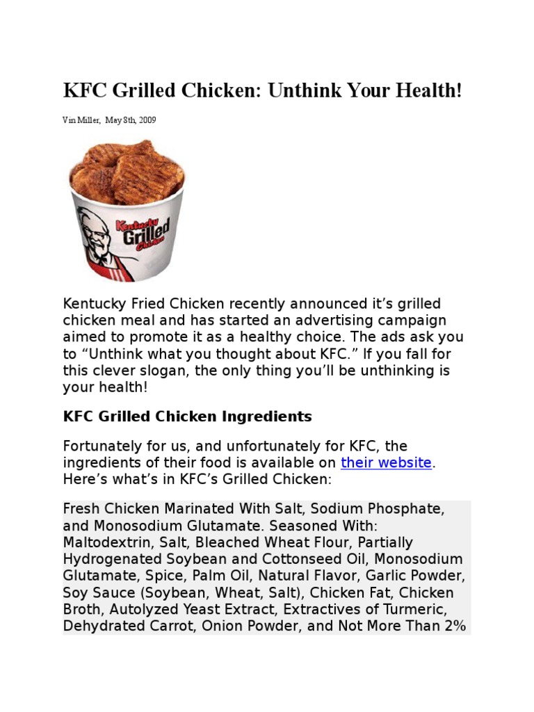 Kfc touts the grilled chicken as having fewer calories, less fat, and less salt than its original recipe fried chicken.